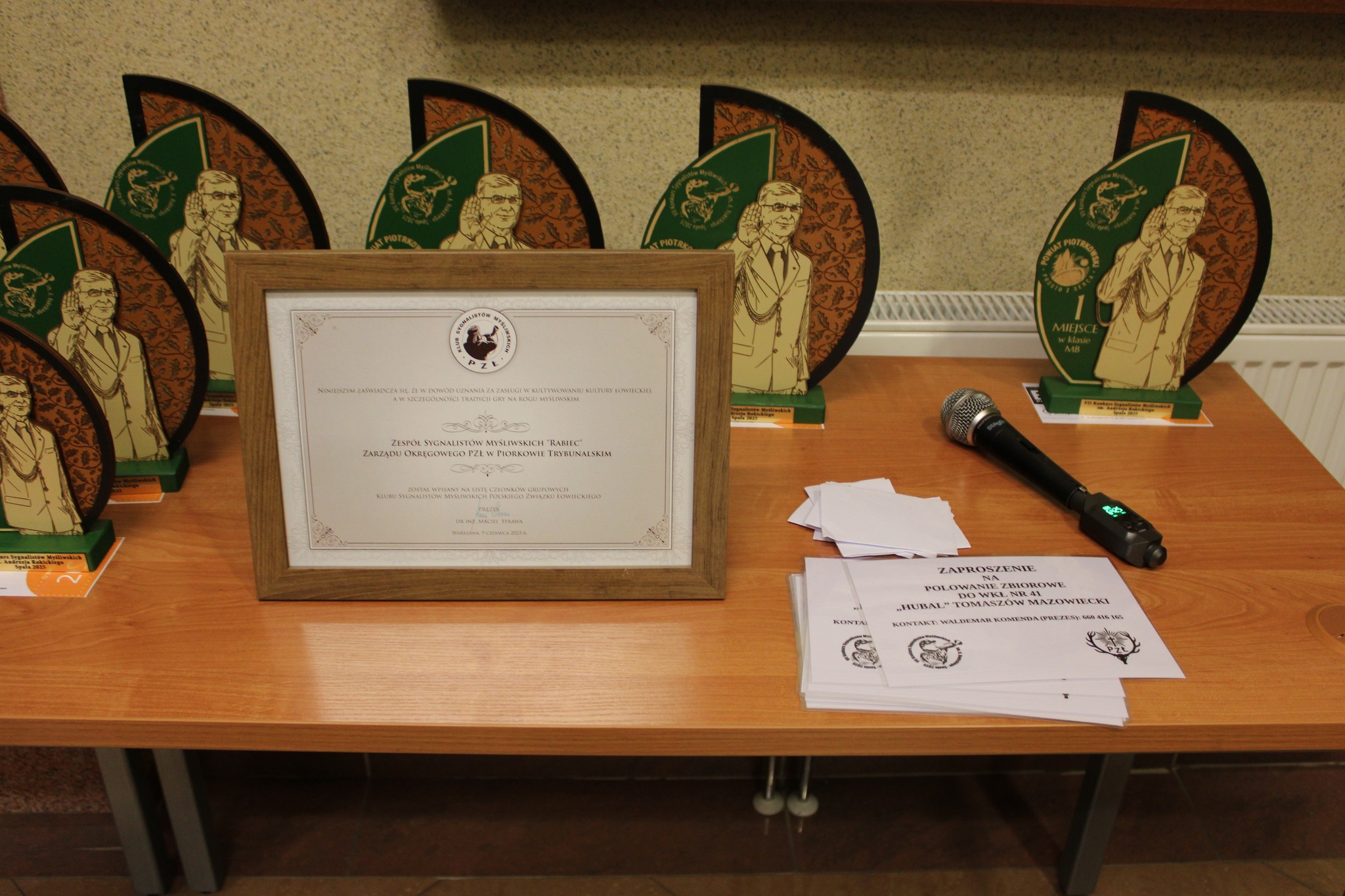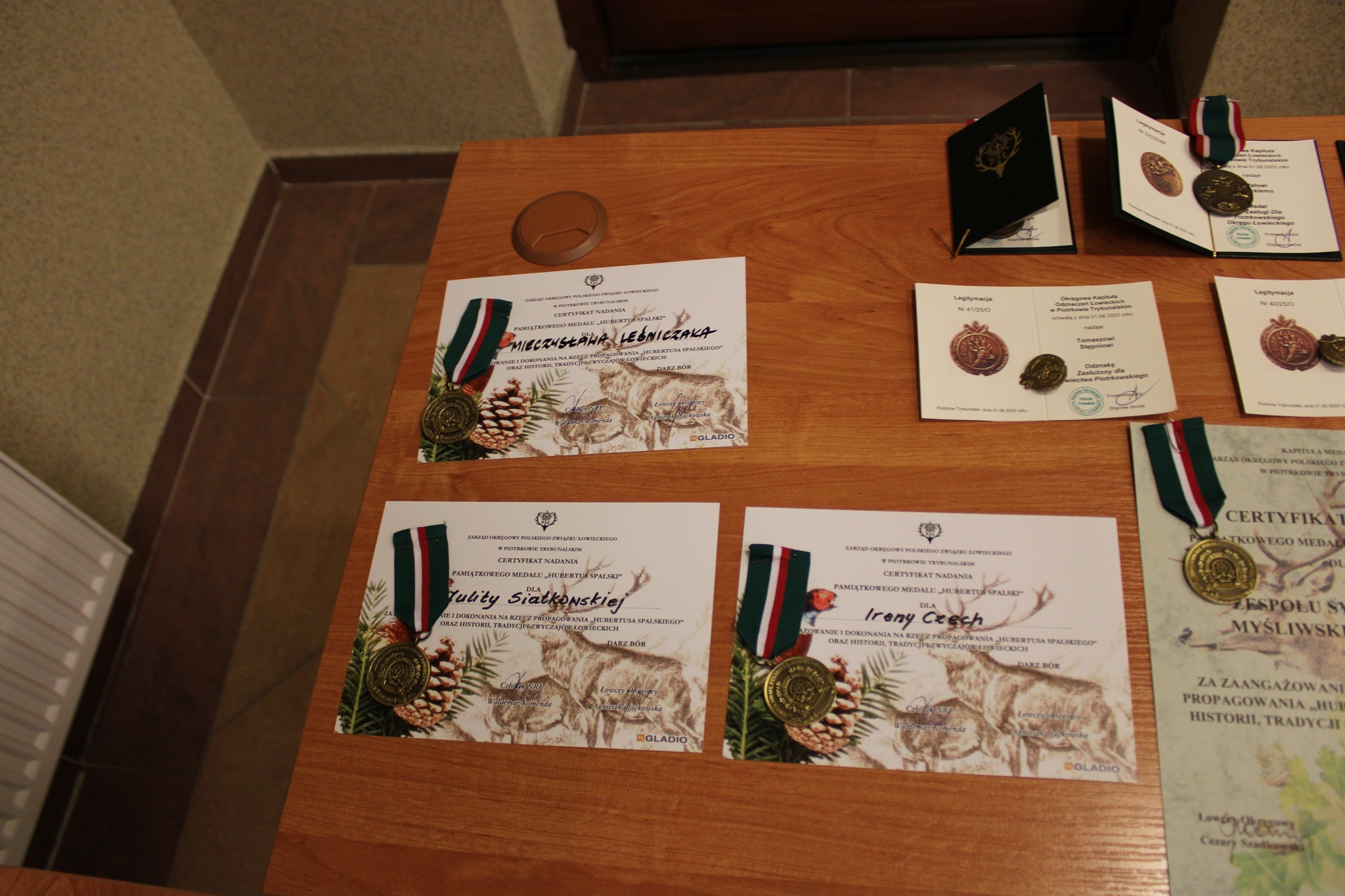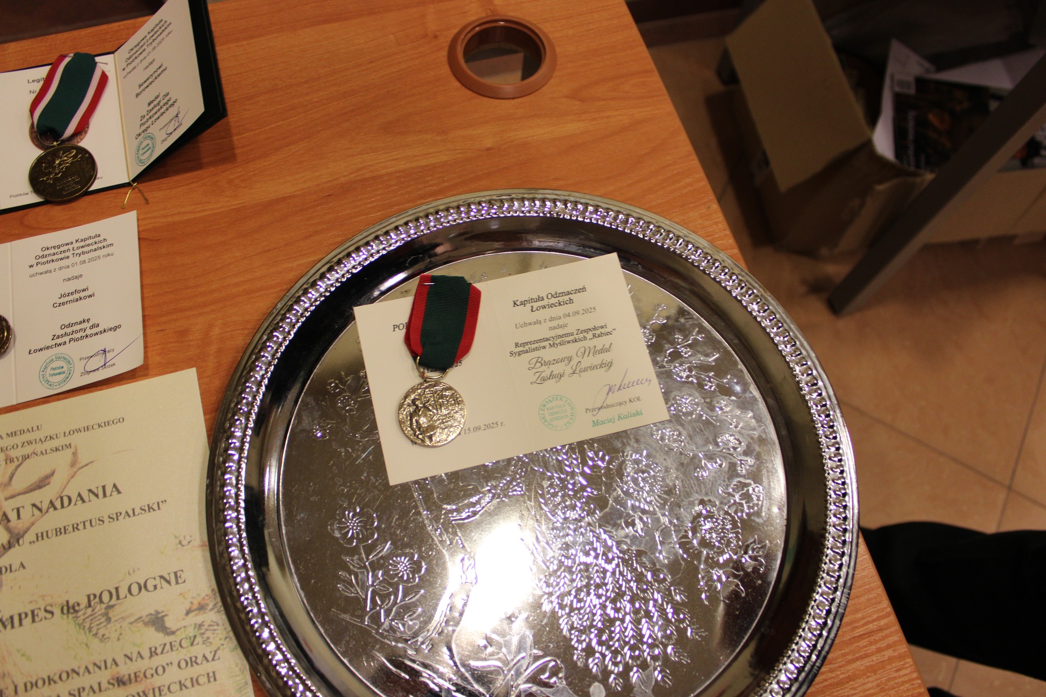 Dodatkowo indywidualnie zostali wyróżnieni: Tomasz Stępień – kierownik Zespołu – odznaką „Zasłużony dla Łowiectwa Piotrkowskiego”; Seweryn Borowiecki – kier. honorowy Zespołu – medalem „Za Zasługi dla Piotrkowskiego Okręgu Łowieckiego”; Julita Siatkowska – kier. ds. promocji – Pamiątkowym Medalem „Hubertus Spalski”. Wręczenia dokonali kol. Waldemar Komenda, kol. Cezary Szadkowski oraz Jacek Chudy – dyr. RDLP w Łodzi.