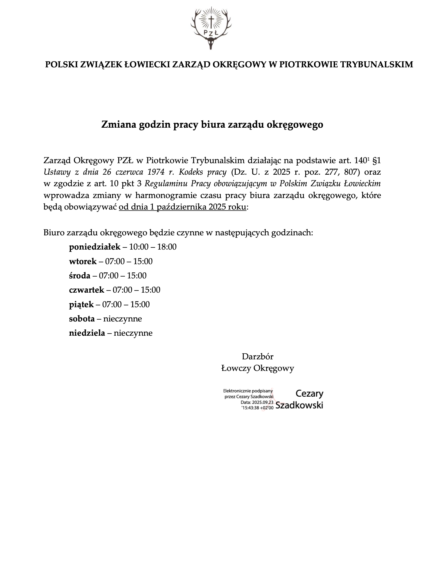 Zmiana godzin pracy Biura Zarządu Okręgowego od 1 października 2025 r.